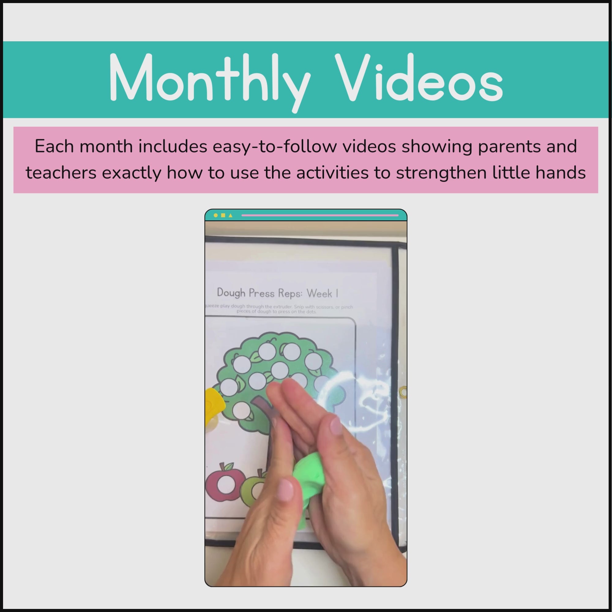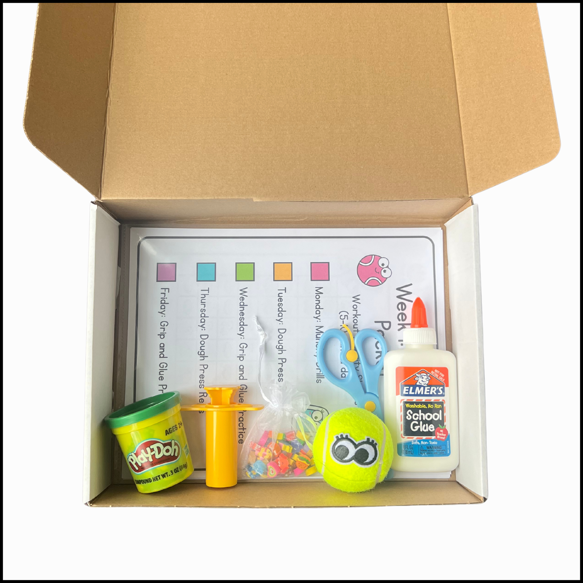 The Workout Kit includes a glue bottle, scissors, playdough, extruder & a Munchy Ball for building hand strength. You use these materials to complete the monthly activities.