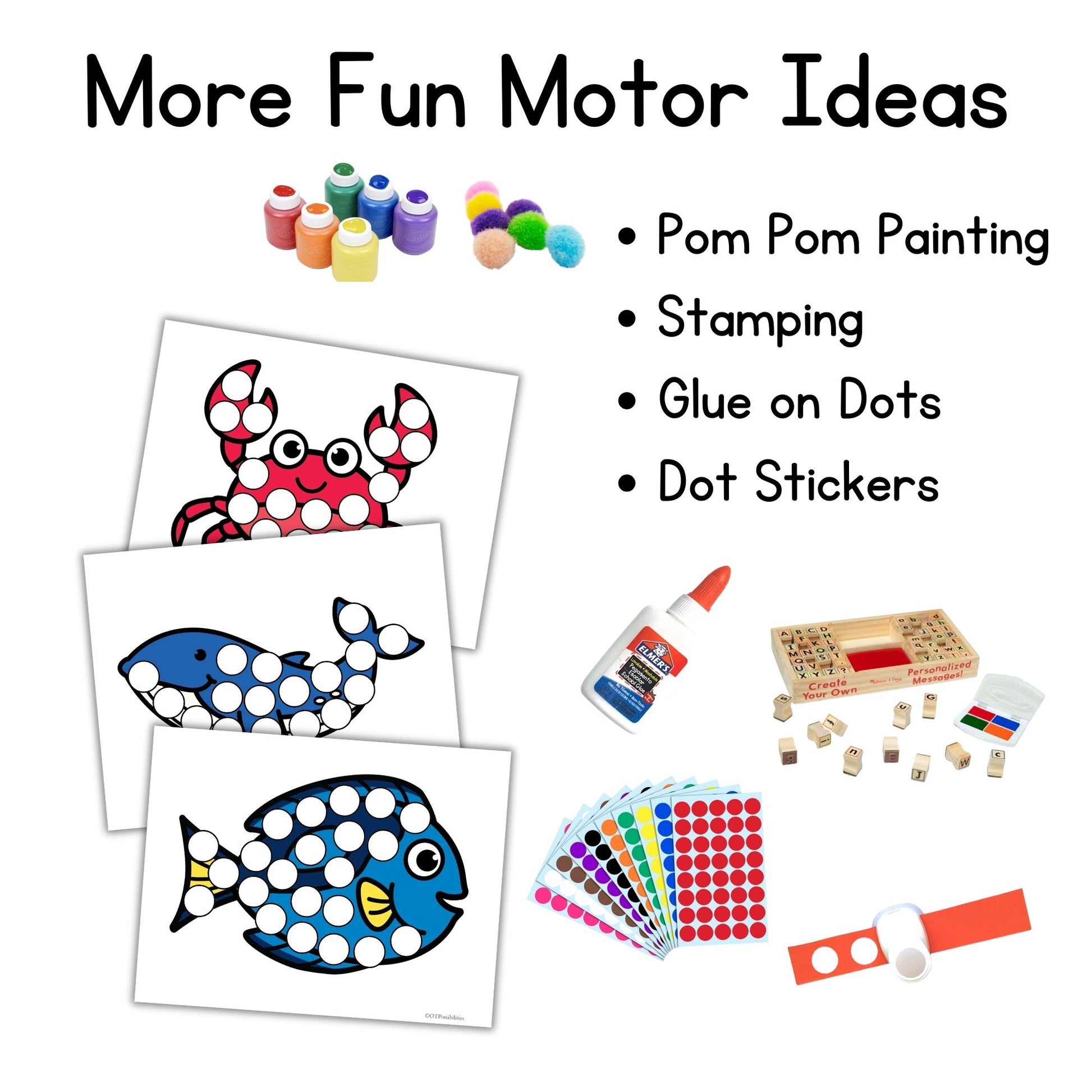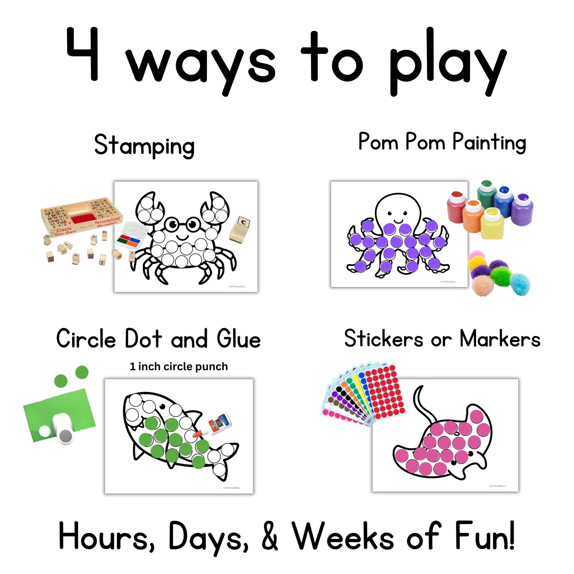 Use them with play dough, dot markers, stickers, stamps, or 1" hole punches for endless hands-on fun.
