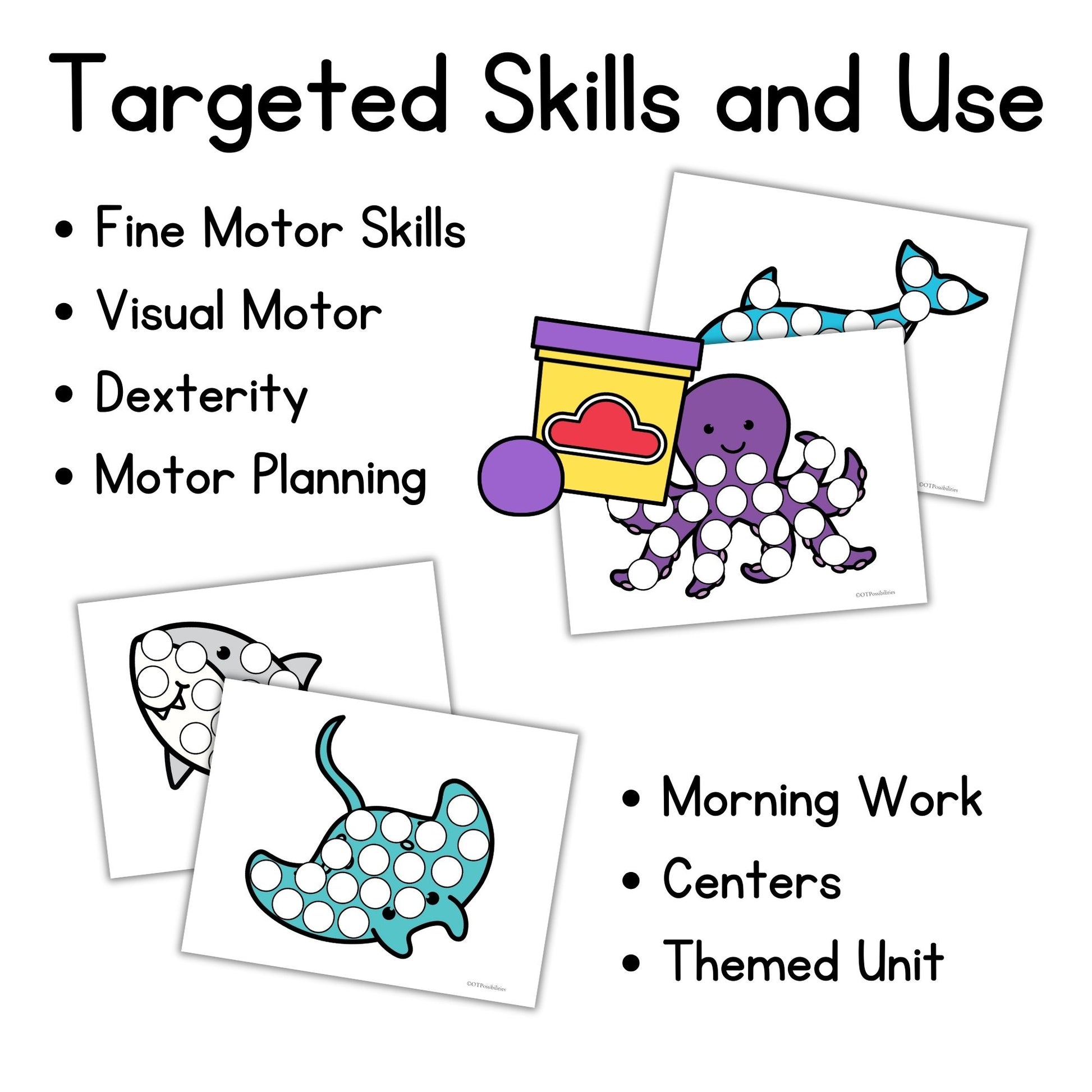 Enjoy ocean-themed play dough mats and dot marker pages! These fine motor activities strengthen little hands while encouraging creativity and coordination.